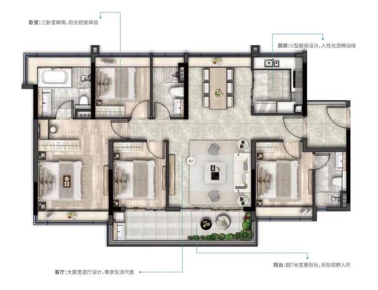 140㎡四房:套内面积131.6㎡,使用率94%,双套间布局,巨幕观景阳台采光面超12米,高层单位可远眺白云山,实现“江景+山景”双重景观;