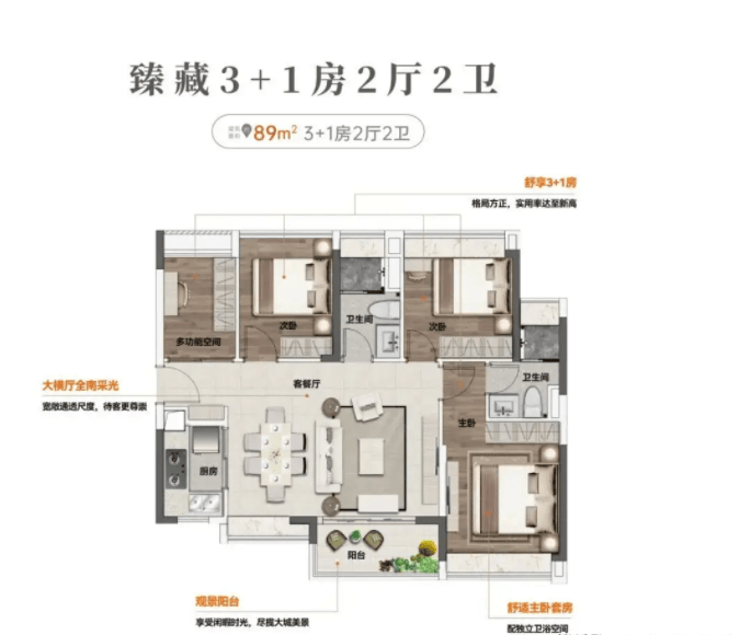 对于有二胎计划或需要更多功能空间的家庭,建面约八十五平方米的四房两卫户型则是不二之选。在周边同面积段产品多为三房的背景下,该项目以更低总价实现了四房配置,堪称“卷王”。四个房间功能分区清晰,既有宽敞的主卧套房,又有独立的儿童房、老人房以及多功能房(可作书房或客房)。这种设计充分兼顾了家庭成长的动态需求,无论是二孩时代的居住拥挤,还是居家办公的空间需求,都能得到妥善解决。高实用率的特点,让每一个家庭成员都能拥有独立的私人空间,互不打扰,和谐共处。