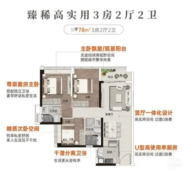 紧接着是建面约七十八平方米的三房两卫户型。这款户型在采光与通风方面表现尤为优异,采用了经典的南北通透格局,确保室内空气对流,阳光满屋。室内空间布局紧凑而实用,动静分区明确。客厅连接宽敞的景观阳台,延伸了视觉空间,也为家人提供了休闲观景的好去处。厨房采用 U 型设计,操作台面充足,洗切炒动线流畅。两个次卧大小适中,可作为儿童房或书房使用,完美适配三口之家的日常居住需求。总价约二百四十九万元,性价比极高,是许多首次置业家庭的理想之选。