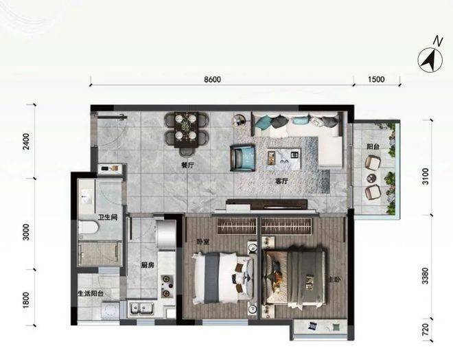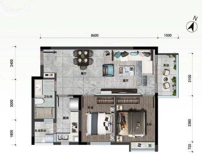 73㎡两房两厅一卫:对于刚需购房者或是小家庭而言,这款户型是理想之选。整体布局紧凑合理,空间利用率高。客厅连接观景阳台,增加空间通透感的同时,可饱览园林或周边自然景观。卧室温馨舒适,保证了居住的私密性。卫生间干湿分离,提高使用效率。厨房设计虽小巧,但功能齐全,满足日常烹饪需求。