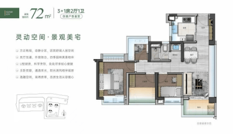 高效的户型设计:采用超高使用率设计,73㎡即可实现四房设计,极大提升了居住空间的实用性。