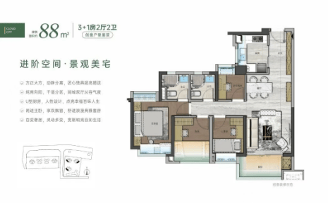建面约88㎡四房两厅:功能齐全,适合小型家庭。
