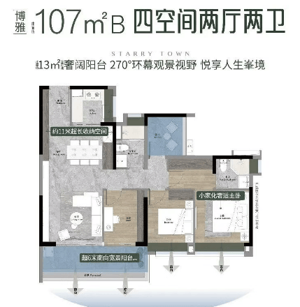 107㎡B四房两厅两卫:经典竖厅设计,动静分区明确,多功能空间尺度宽阔,满足二胎家庭需求,主卧自带独立衣帽间。