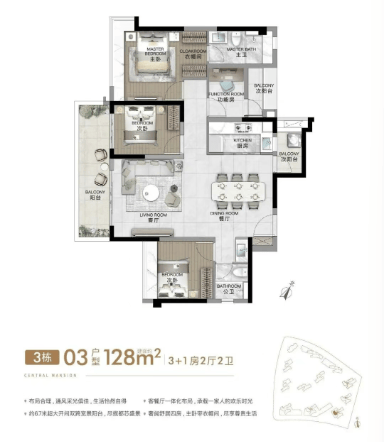 项目规划了12栋24-30层高的住宅,分为两期开发。目前在售的一期包括1-4号楼,均为现楼精装交付。户型涵盖约98㎡的2+1房、116㎡的3+1房、127㎡和128㎡的3+1房等多种类型,满足不同家庭的需求。其中,98㎡户型三开间南向采光,配备超大景观阳台和270°转角飘窗;116㎡户型采用U型厨房布局,南北通透;127㎡和128㎡户型则以大面宽横厅设计,最大化利用景观资源。所有户型均采用高标装修交付,配备VRV中央空调、全屋智能系统、全屋紧扣厨卫等高端设备,外立面采用双层中空low-e玻璃和中置百叶材质,有效隔热降噪。