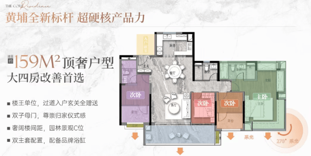 项目采用围合式布局,由6栋47层高层住宅组成,其中2#楼为“楼王”产品,两梯四户;其余楼栋为三梯六户。所有户型均以超100%使用率打造,这一指标在黄埔乃至整个广州都极为罕见,极大提升空间实用性与性价比。