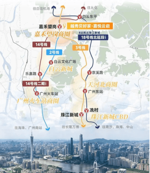 3 号线可直达机场、珠江新城、天河北等核心区域,2 号线连接白云新城、公园前等商圈及交通枢纽,14 号线(在建二期)进一步拓展了出行范围,15 分钟可通达白云新城,30 分钟可达珠江新城,能快速到达广州主城核心区域,对于在主城区工作的人群来说通勤十分便捷。