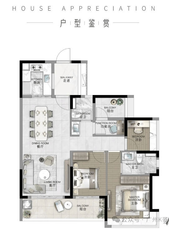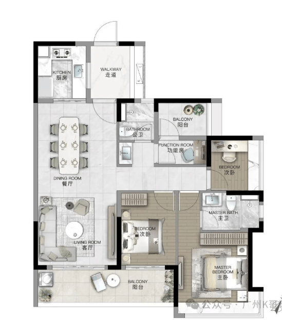 建面约116㎡ 3+1房2厅2卫:U字型厨房布局,环绕式操作空间,超大方厅设计。