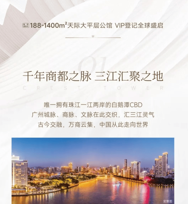 白鹅潭瑞玺提供的住宅户型包括约188至1400平方米的大平层,适合追求高品质生活的高净值人群。此外,还提供约36至70平方米的2至4房商办单位,满足不同用户群体的需求。