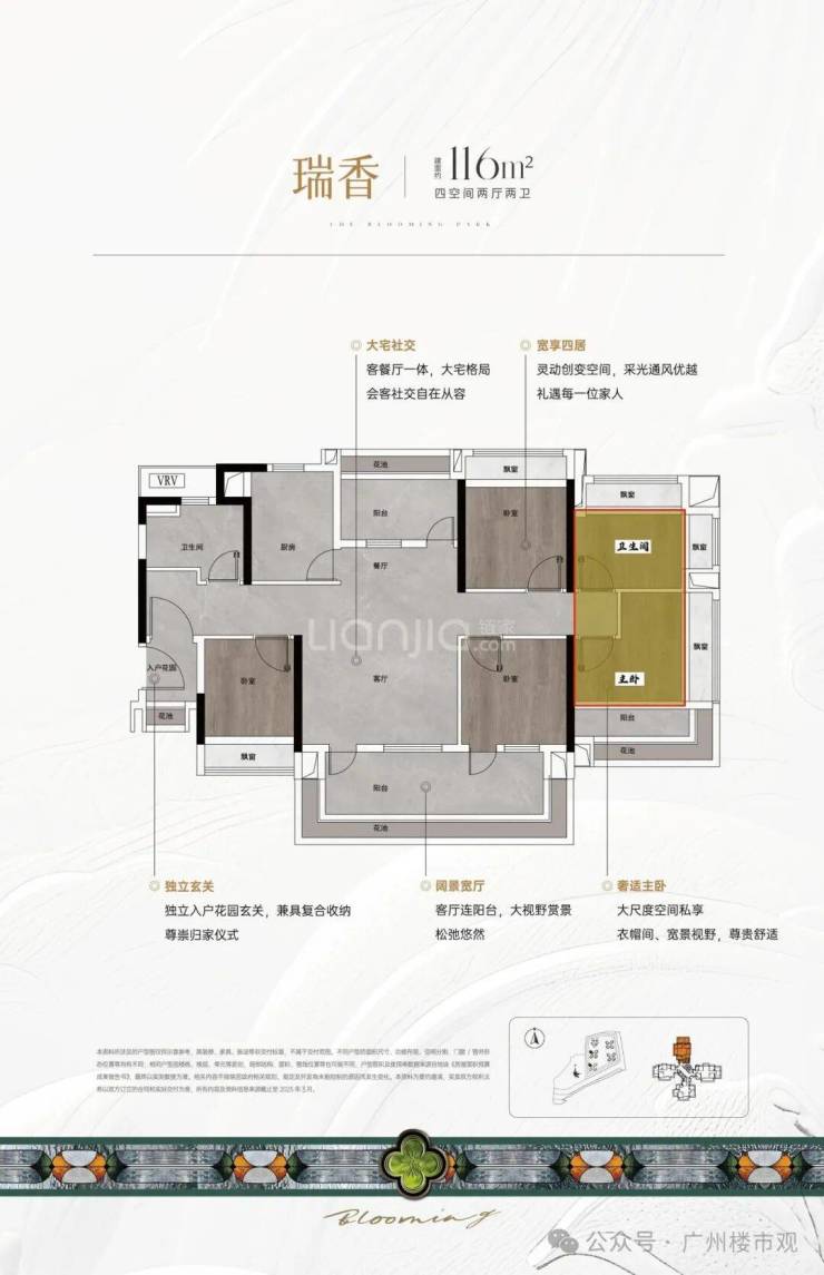 此外,项目的建筑设计充分考虑了广州的气候特点,采用南北通透的布局(115平及以上户型均为南北对流),搭配横幕大阳台、卧室全景舱飘窗等设计,既保证了室内的通风与采光,又能有效降低夏季的闷热感,提升居住的舒适度,真正实现“以人为本”的建筑设计理念。