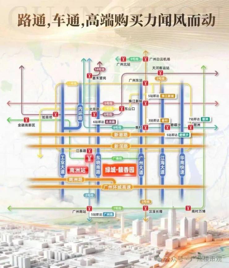 项目紧邻地铁2号线与广佛线换乘站南洲站,直线距离仅约100米,真正实现“双地铁上盖”,无缝衔接广州全城及佛山核心区域。其中,地铁2号线作为广州南北向核心交通干线,可快速串联起白云国际机场、广州火车站、珠江新城、客村等重要节点,从项目出发,3站可达客村商圈,5站直达珠江新城CBD,7站可至琶洲人工智能与数字经济试验区,轻松实现“通勤无忧、畅达全城”;广佛线则连接广州与佛山核心区域,8站即可通行万博商圈、金融城、白鹅潭商圈,进一步拓宽生活与工作半径,满足跨城通勤、休闲购物等多重需求。