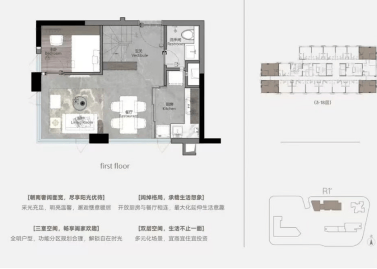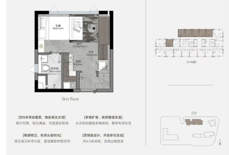 本次加推 R1 栋,主打建面约 38-55㎡四面宽 LOFT 产品,4.5 米标准层高,买一层得两层,实际使用率高达 120%,空间利用率远超普通住宅与公寓。所有户型均采用全明设计,双面宽或三面宽采光,通风采光效果极佳,无暗角、无压抑感,居住体验媲美平层大宅。