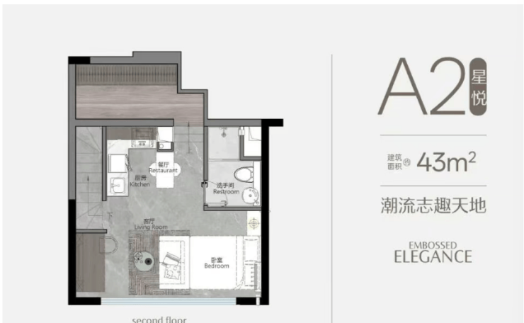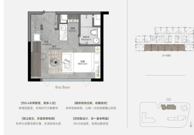 43㎡南向户型:自住投资两相宜,5.4 米超大开间,采光面充足,全屋通透舒适。4.5 米挑高设计,可灵活隔成两层,下层打造客厅、厨房、卫生间,上层规划卧室、储物区,动静分区明确。南向户型全年采光充足,冬暖夏凉,居住舒适度极高,适合单身贵族、年轻情侣自住,也可作为轻奢出租房源,租金收益可观。