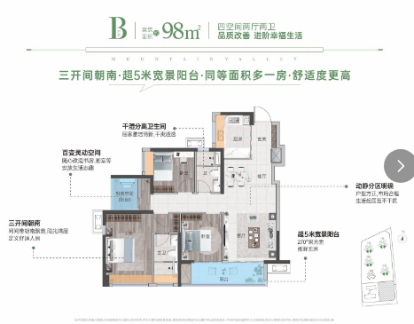 天地源伴山溪谷提供约84㎡、97㎡、101㎡的三至四房户型选择,满足不同家庭结构的需求。户型设计注重空间的高效利用,超9成使用率,户户配备超5米大阳台,部分户型还带有高赠送面积,增加居住舒适度。全南向户型设计,保证充足采光与良好通风,让阳光洒满房间的每一个角落。同时,户型布局合理,动静分区,为业主提供安静舒适的居住空间,无论是新婚夫妇还是三代同堂家庭,都能在这里找到理想家园。