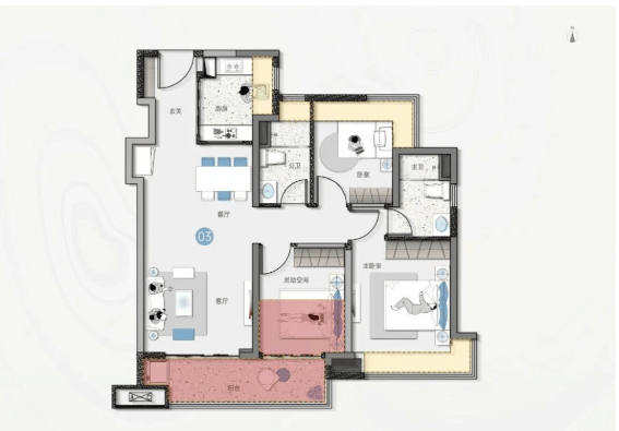 南北对流四房格局,约6.4米的大阳台,四开间朝南,景观面宽阔,22㎡南向望江的主卧尺度感十足,46㎡LDKB大客厅,适合改善型家庭。