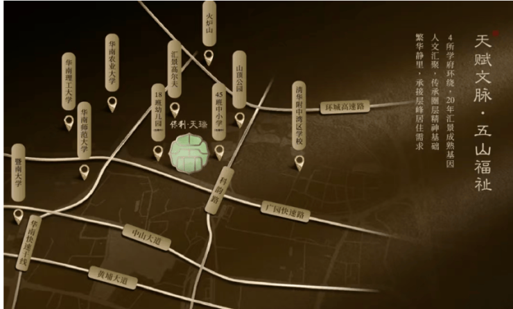 板块: 保利天瑞雄踞天河五山汇景新城板块,这是广州公认的顶级豪宅聚集地之一。项目位于珠江新城与琶洲金融城两大核心经济引擎的几何中心,处于城市发展的黄金十字轴线上。这一区域不仅是广州高端人才的汇聚地,更是财富与资源的制高点。周边环绕着成熟的国际社区,人文氛围浓厚,社会秩序井然。作为天河区的“后花园”,这里既保留了老广州的烟火气,又融合了国际化的现代气息。地块前身虽为物流园,但经过政府的高标准规划与保利集团的匠心重塑,已彻底焕新为城市中心的低密宜居典范。其地理位置的稀缺性在于,在天河核心区几乎无新增低容积率用地的背景下,保利天瑞的出现填补了市中心高品质小高层住宅的市场空白。