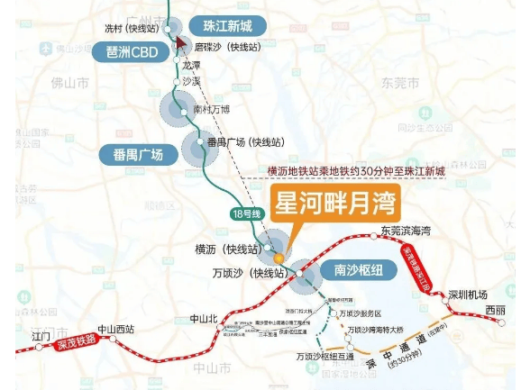 交通优势显著,项目接驳地铁 18 号线横沥站,交楼后将开通免费业主楼巴接驳。地铁 18 号线时速 160km/h,1 站番禺广场,2 站琶洲,3 站直达珠江新城。距南沙枢纽站约 5 公里,未来接入深江高铁,可快速通达湾区各地。自驾依托门前灵新大道(南沙第二条主轴),便捷出行。