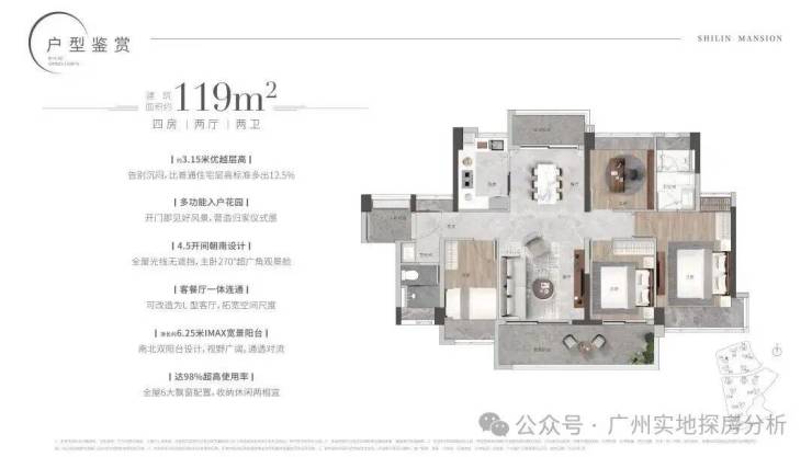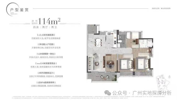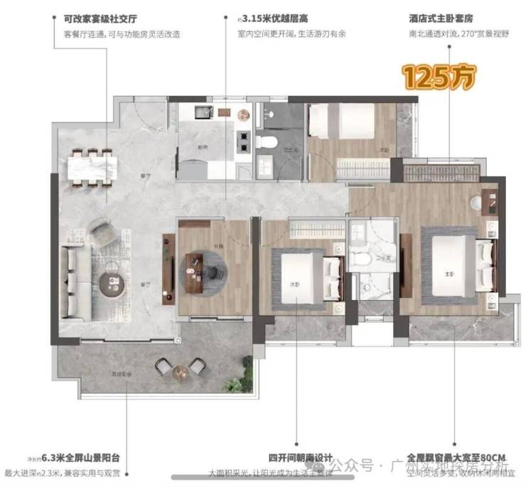 约3.3米墅级层高,高配双主套三卫,五开间全朝南,主卧客厅双270°转角,净长约6.3米巨幕山景阳台,最大净进深约2.2米,实用率高达97% 带花池入户花园,全屋6大飘窗配置。