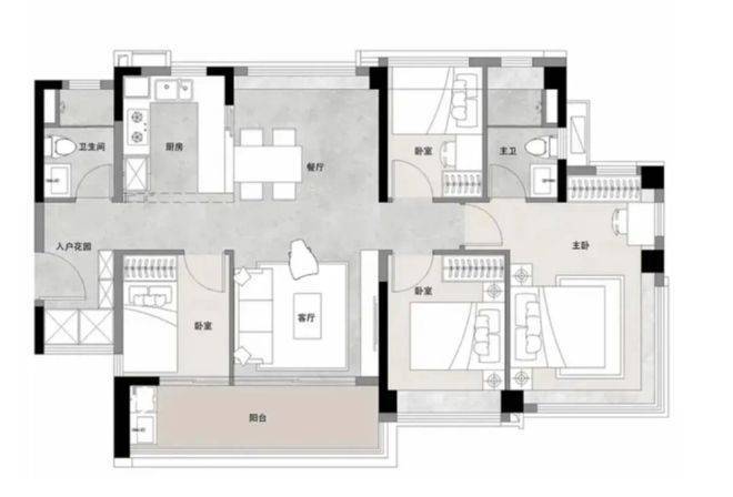 约84平三房两卫:四开间朝南,双阳台设计,主卧套房带L型飘窗,次卧灵活可改横厅,满足年轻家庭需求。