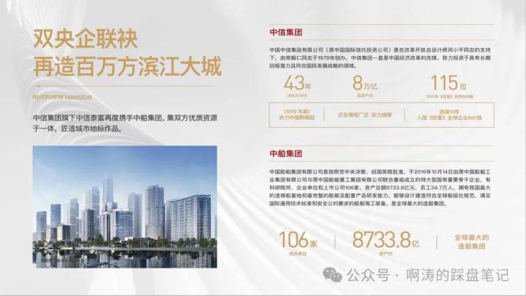 广州滨江天地由**中信泰富地产+中船集团**双央企联袂开发,双世界500强企业强强联合,以雄厚实力铸就城市标杆。中信泰富地产为中信集团全资子公司,世界500强排名稳居前列,深耕地产行业多年,业务覆盖房地产、能源、特钢等多元领域,资金实力雄厚、开发经验丰富,打造多个城市级标杆综合体。中船集团作为全球最大造船集团,世界500强位居前列,资产规模庞大,具备顶级资源整合能力与工程建造实力。