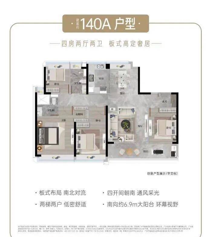 140㎡高定四房:板式布局,南北对流,全屋精装,配备双套房系统,主卧带独立衣帽间及卫浴,性价比至高。
