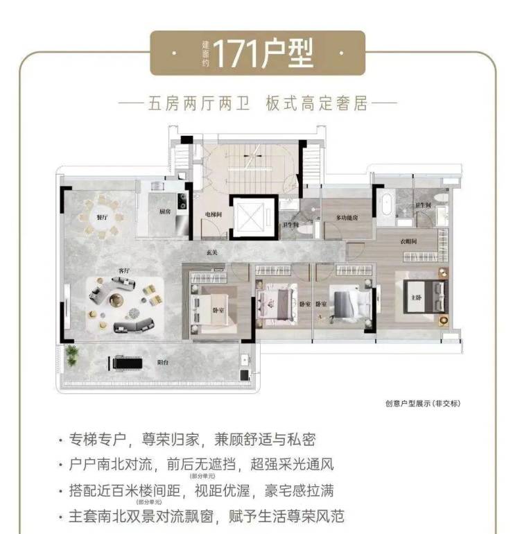 171㎡奢适五房:8F小高层,专梯入户,五房设计满足大家庭需求,中西双厨+270°观景阳台,尽享尊崇体验。