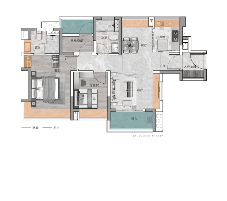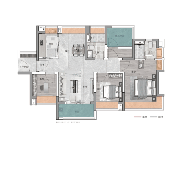 此外,3个房间还带飘窗,为空间拓展增加了更多的可能性;至于灵活空间,也可给生活增添无数可能。