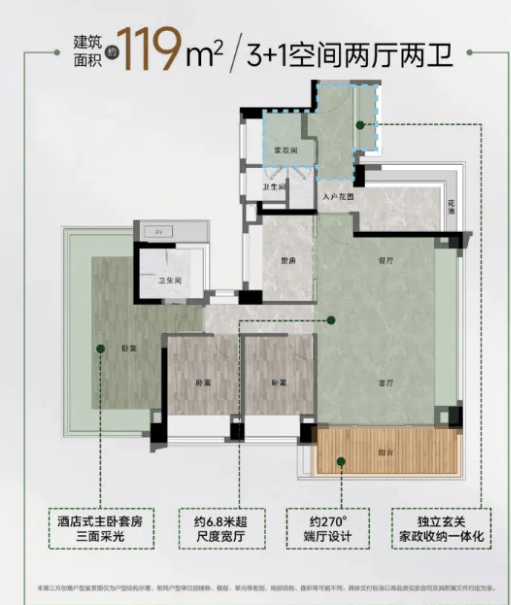 119-139平四房两卫户型,总价280万起,定位高端改善,空间舒适度拉满。户型方正大气,南北通透,客厅与餐厅一体化设计,搭配大面宽阳台,观景与通风效果极佳;主卧套房设计,配备独立卫浴、衣帽间,彰显尊贵感;次卧空间充足,可根据需求改造为书房、儿童房或老人房,灵活适配家庭不同阶段的需求。两大组团户型均延续了万科的人性化设计理念,细节处尽显匠心,为业主打造舒适宜居的居住空间。