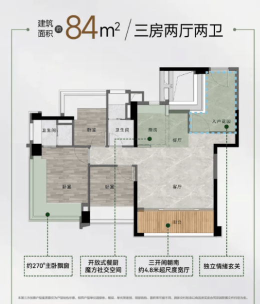 84-93平三房两卫户型,总价180万起,空间尺度更开阔,适合三口之家居住。户型采用动静分区设计,客厅与卧室互不干扰,双卫生间设计避免了日常使用冲突,提升居住舒适度;主卧配备独立卫浴,保障私密性,阳台空间宽敞,可兼顾晾晒与休闲功能,部分户型还带有飘窗设计,增加空间利用率与观景体验。