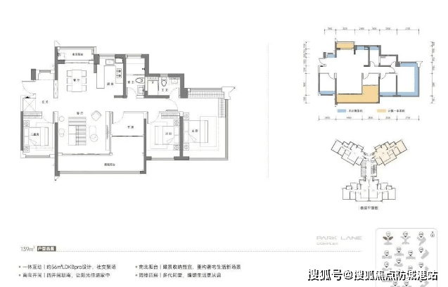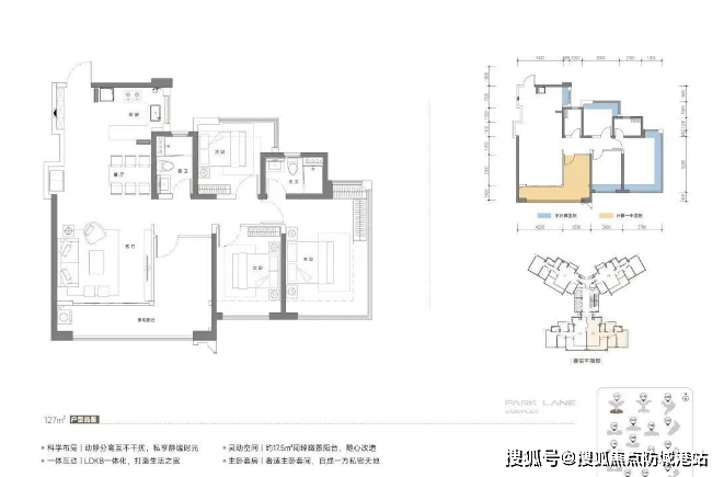 143㎡小高层:专梯入户,户户朝南,阳台与客餐厅一体化设计,实测得房率达82%。