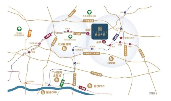项目位于广州第三发展中轴线 “科技创新轴”,天河智慧城与黄埔科学城双城交汇,区位优势显著:科技创新轴北起中新知识城、南抵大学城,汇聚金融总部、人工智能等产业,未来 GDP 将超 1 万亿;天河智慧城(“广州硅谷”,2500 家企业进驻)、科学城(万亿级产业集群)环绕,可承接天河外溢客群,区域价值潜力大。交通方面,距地铁 6 号线黄陂站直线约 1.8 公里(需接驳),但周边 “五横三纵” 路网密集(广汕路、广园快速、广佛肇高速等),自驾 1 小时内可达中心城区,40 分钟内抵达珠江新城、天河智慧城,科学城、智慧城通勤尤为便捷,适合自驾为主的购房者。