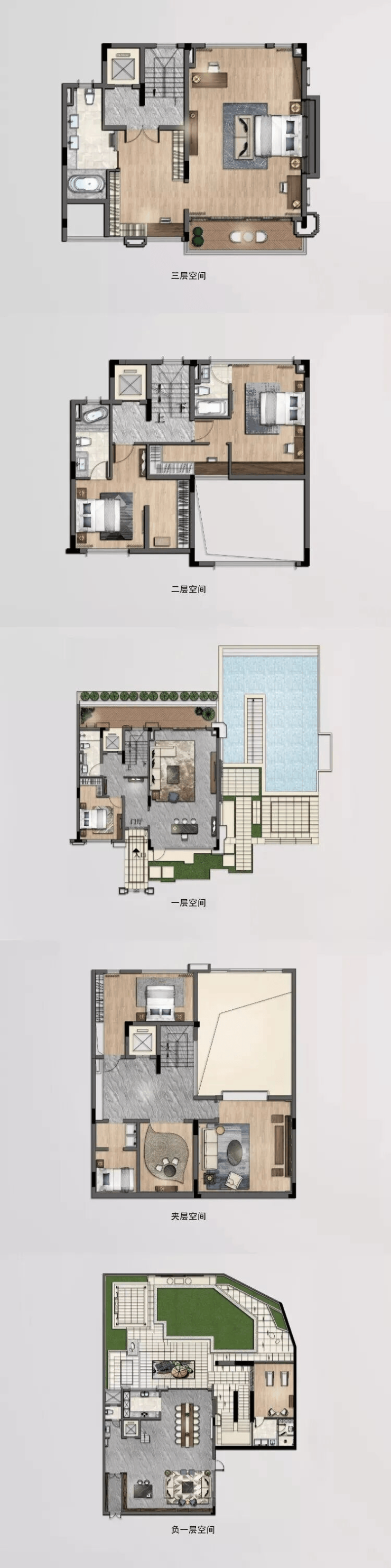 五矿万樾台共推出三种建面户型:约165㎡(愉樾)、198㎡(得樾)、216㎡(和樾),均为地上三层、地下两层结构,实用面积高达350~480㎡,空间尺度远超普通住宅。