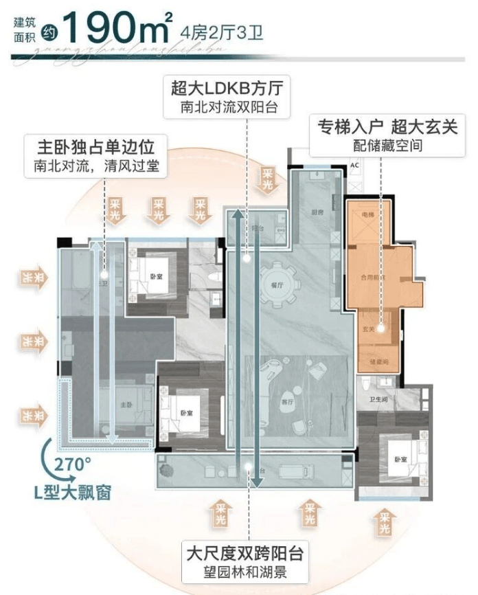 190平方米的四房三卫户型,总价约1200万起,主打LDKB一体化空间,84平方米的公共区域让家人之间的互动更加紧密。9.4米的全景宽幕阳台,配合主卧270度的折叠屏飘窗,观景效果极佳。中西双厨的设计,满足了不同烹饪习惯的需求,让厨房也成为家庭社交的中心。