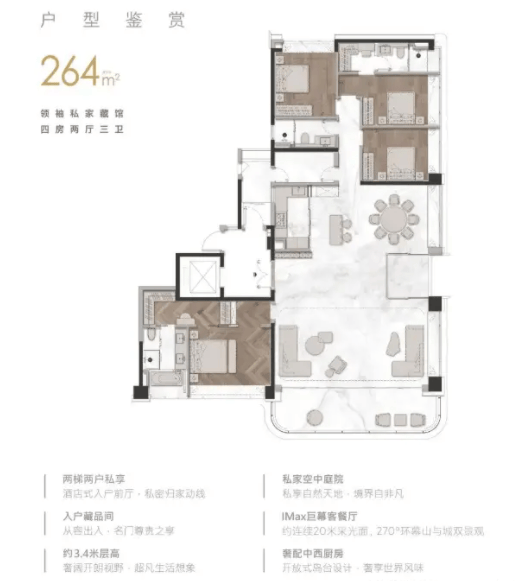 对于追求更高生活品质的改善型客户,项目还推出了一百八十平方米和二百六十四平方米的豪华大户型。一百八十平方米的户型空间更加阔绰,客厅开间达到了惊人的尺度,足以举办小型的家庭聚会。主卧不仅面积巨大,还配备了全景落地窗,可以将窗外的园林美景或城市风光尽收眼底。二百六十四平方米的户型则是真正的豪宅典范,超大的面宽设计,让室内充满了阳光和空气。多个阳台的设计,不仅增加了使用面积,更提供了绝佳的观景平台。无论是俯瞰白云山的苍翠,还是远眺城市夜景的璀璨,都能让人心旷神怡。