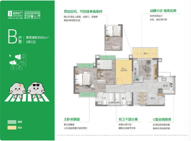 在产品打造上,项目推出建面约86至152平方米的多功能N+1户型,涵盖三房至四房产品,适合刚需与改善型家庭。其中,约86平方米户型实现三房两卫格局,得房率表现优异,空间利用高效。户型采用南北对流、双阳台设计,客厅连接约6米大阳台,采光充足,视野开阔,部分单位还可打造“空中花园”。主卧套房设计保障私密性,U型厨房动线合理,干湿分离的双卫提升使用便利性。更大面积段的户型则进一步拓展了居住尺度,满足多口之家对空间与功能的更高要求。