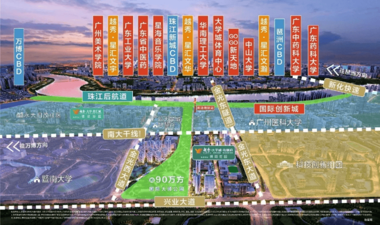 自驾出行同样便捷:南大干线已全线贯通,5分钟直达万博中心;金光东隧道通车后,5分钟直连大学城一期,实现一、二期资源共享。项目处于广州“一核两翼”城市战略要地——国际创新城核心腹地,北接生物岛,南启南岸起步区,集科研、教育、产业于一体,未来发展潜力不可估量。