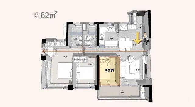 建面约82㎡三房两厅两卫户型:该户型是项目的刚需主力户型,设计紧凑、实用,适合三口之家或新婚夫妻居住,具体布局及特色如下:户型整体坐南朝北,所有卧室均朝南,南边是客厅、卧室,北边是双卫、厨房,整个空间的通风和采光极佳,能够有效避免岭南地区的潮湿问题,让室内始终保持干燥、明亮。入户处设有入户花园,不仅能够增加户型的实用率,还能作为玄关使用,放置鞋柜、杂物等,提升入户的仪式感,同时也能起到一定的隔音、防尘作用。
