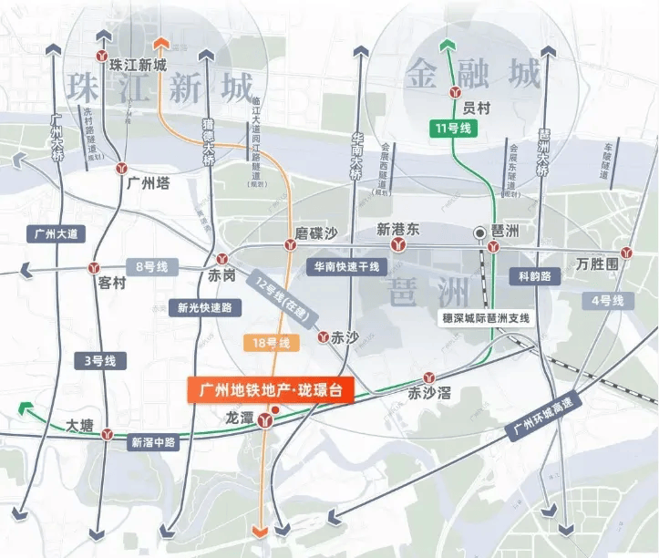 18号线作为广州首条高速地铁线路,目前已全线开通运营。从珑璟台出发,1站即可抵达琶洲核心区,2站直达珠江新城,通勤时间控制在15分钟以内,极大提升了日常出行效率。而11号线作为广州首条环线地铁,未来全线贯通后,将无缝连接白云新城、广州东站、金融城、白鹅潭等城市核心枢纽,形成覆盖全城的高效交通网络。