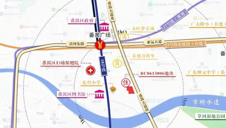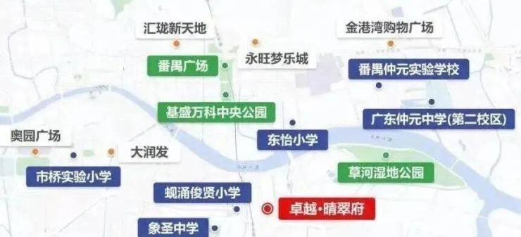 项目周边商业资源丰富,三公里范围内有番禺宾馆、钻汇珠宝广场、繁华路商业街、易发步行街和友谊商店等历史悠久的商业配套,生活便利且人流充足。同时社区内享有六公里河岸线景观,周边自然资源与商业资源叠加,为居民提供生态宜居与城市便捷的双重体验。教育方面,市桥实验小学、桥城中学、象圣学校及诺宝幼儿园等优质教育资源环绕社区,为家庭子女提供便捷入学通道。医疗设施完备,广州市番禺区中心医院、番禺区中医院及妇幼保健院近距离保障居民健康生活。