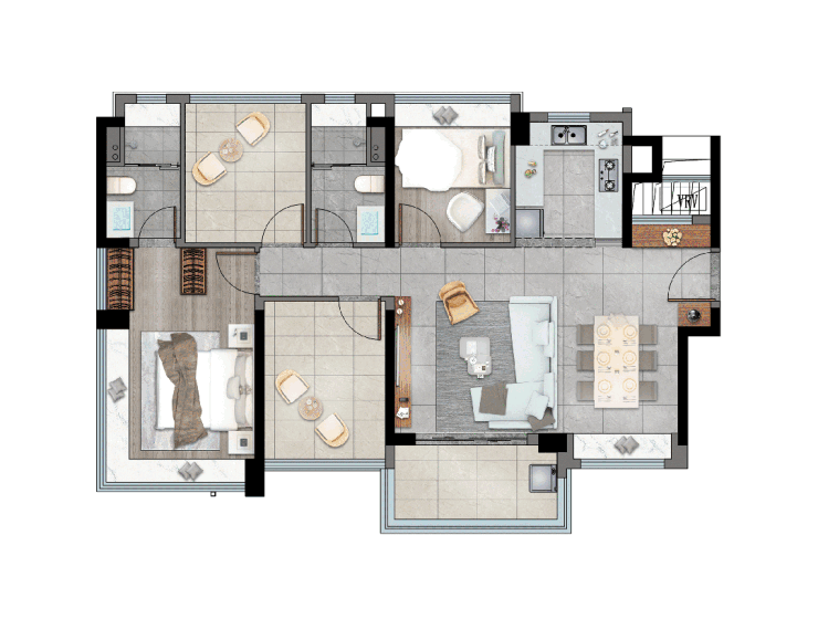 卓越·晴翠府户型建筑面积约八十九至一百三十平方米,提供三至四房布局,满足不同家庭需求。主卧设计酒店式套房,配备二百七十度转角飘窗,采光充足,视野开阔,每户均可享受宽敞观景空间。户型内自由设计空间丰富,可根据家庭需要调整为书房、儿童房或茶室,实现多功能灵活使用。客餐厅采用大横厅设计,空间感宽敞;U型厨房搭配定制岛台,使烹饪与交流相结合,兼顾功能性和居家体验,充分满足改善型和多样化家庭生活需求。