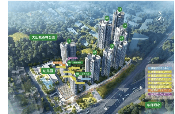 项目总建筑面积约20万平方米,规划9栋住宅,采用点式塔楼布局,依山而建,最大限度减少楼栋间视线遮挡,确保多数单位享有大山乸森林公园景观。整体容积率为3.38,在南沙核心区属中等偏高密度,但通过科学排布与梯户比优化(主力为两梯四户及两梯五户),有效平衡居住效率与舒适度。总户数约1140户,配建车位1336个,车位比达1:1.17,满足家庭多车需求。尤为难得的是,项目西侧紧邻约946万平方米的大山乸森林公园,形成“推窗见山、下楼入园”的生态格局,在高度城市化的区府板块中独树一帜。