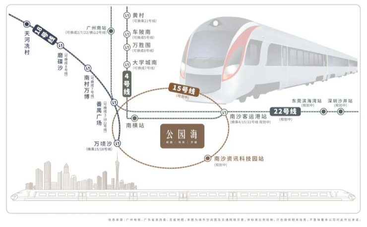 公园海项目交通便利,距离已开通的地铁 4 号线南延段南横站约 1 公里,步行 15 分钟即可到达。未来,规划中的 15 号线南沙资讯科技站距离项目仅 500 米左右,建成后可接驳 18、22 号线,快速通达天河、番禺等中心地。此外,项目周边 1 公里内有多个公交站,南沙资讯科技园站、南横村等,满足日常居民的出行需求。
