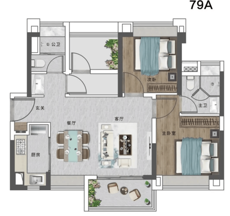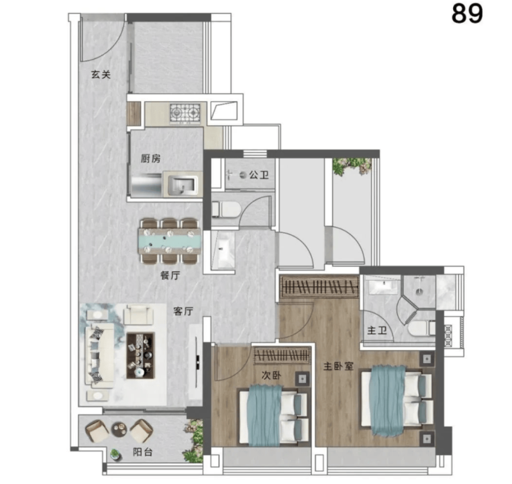 公园海项目提供多种户型选择,主力户型为 79-118 平方米的三至四房。79㎡户型为 2+1 房 2 厅 2 卫,采用横厅设计,三开间朝南,采光通风佳,还带有双卫,在市场上具有很强的竞争力。89㎡户型为 2+2 房 2 厅 2 卫,买两房得四房,性价比高,入户处带有多功能区,可改造为小书房、杂物间或入户小花园。118㎡户型为四房两卫,横厅设计,超 6 米景观阳台,视野开阔,主卧带有独立衣帽间与卫浴,居住舒适度极高。