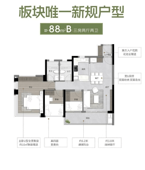 88㎡创意三房两卫:可变双开间宽阳台,主卧能多送一个步入式衣帽间,客厅开间达3.9米,中西厨分离。