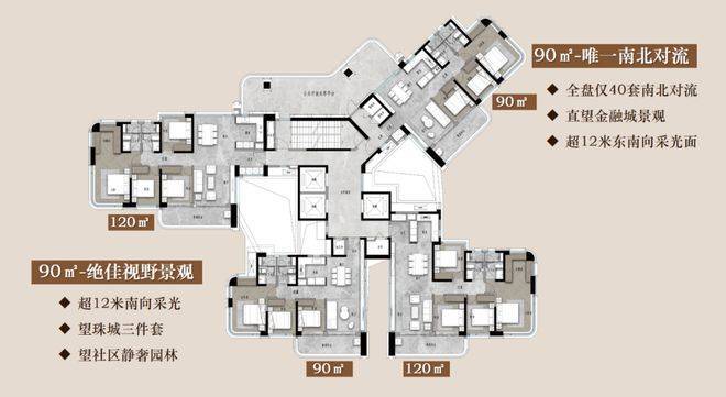 项目户型设计的核心优势十分鲜明,首先是圈层纯粹,所有户型均为改善型设计,面积段在90-220㎡之间,面向的客群非常纯粹,均为改善型家庭、高净值人群和职场精英,能够保证社区的圈层品质,让业主在日常生活中能够结识同圈层的朋友,实现资源互补。其次是景观视野极佳,南地块板楼户型可享受侧向江景和珠城景观,高层户型更是能俯瞰珠江美景和一江两岸的繁华天际线,引景入室,让业主在室内就能享受沉浸式的自然体验和城市景观,提升居住的舒适度和幸福感。最后是人性化的细节设计,所有户型均采用大开间大面宽设计,力求采光面做到最大化,同时融入适配广州本地气候的防潮、防晒工艺,注重功能分区的合理性,动静分离、干湿分离,兼顾实用性与尊崇感,细节之处尽显匠心。