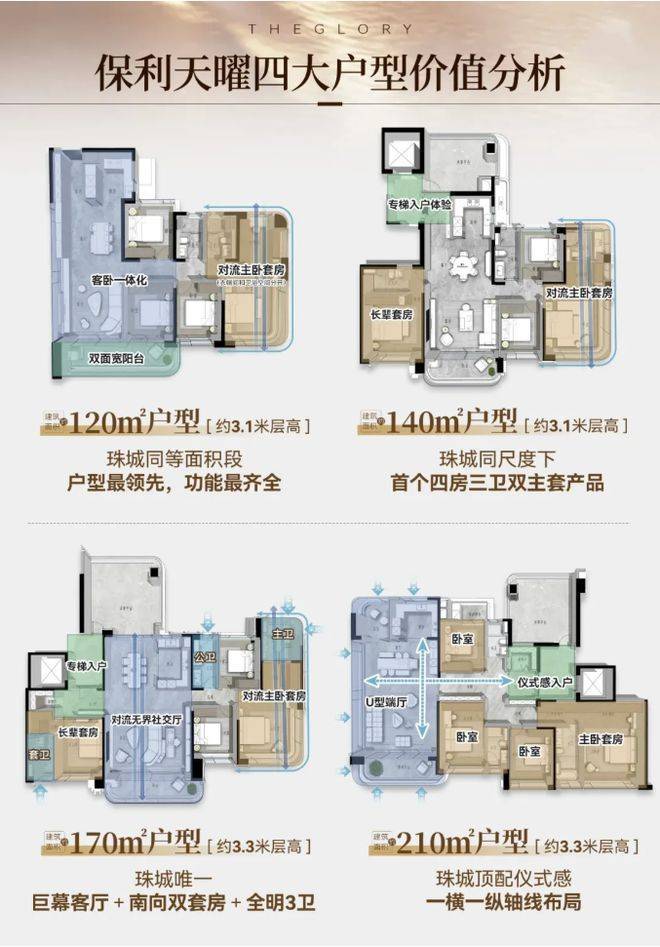 120-210㎡户型为项目的主力户型,以四房设计为主,空间尺度更大,舒适度更高,适合人口较多的改善型家庭居住。其中,南地块板楼的主力户型为120-210㎡四房,采用正南北全T2板楼设计,板式户型规整,通风性强,互视少,可延伸南向大面宽,规划更多南向开间,实现专梯入户,彰显业主的尊崇感。户型采用灵活的空间布局,可根据家庭需求调整空间功能,兼顾实用性与灵活性;客厅采用大横厅设计,开间宽敞,搭配超大景观阳台,能够最大程度引景入室,让业主在室内就能欣赏到珠江江景或城市景观,视野开阔;双卫生间或多卫生间设计,避免了高峰时段的使用拥堵,提升了居住的便捷性;主卧配备独立卫生间、衣帽间和景观飘窗,私密性强,舒适度极高,能够满足主人的高端居住需求;次卧空间宽敞,采光充足,可作为儿童房、客房或书房,适配大家庭的多元居住需求;厨房采用U型设计,操作空间充足,搭配生活阳台,兼具实用性和便捷性,能够满足日常烹饪和储物需求。