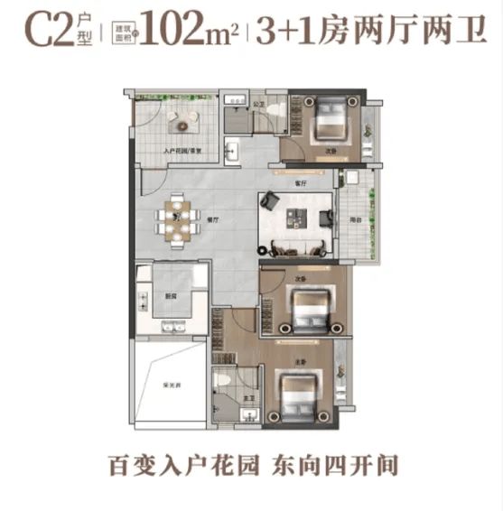 102㎡四房两厅两卫:客厅开间超4米,空间舒展,适合三口之家成长过渡,总价约347万;