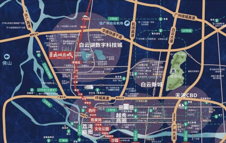 自驾方面,项目紧邻许广高速与华南快速干线,35分钟内可覆盖天河CBD、荔湾老城区、越秀行政中心等核心区域。双轨+双高速的立体交通网,让“半小时生活圈”成为现实。