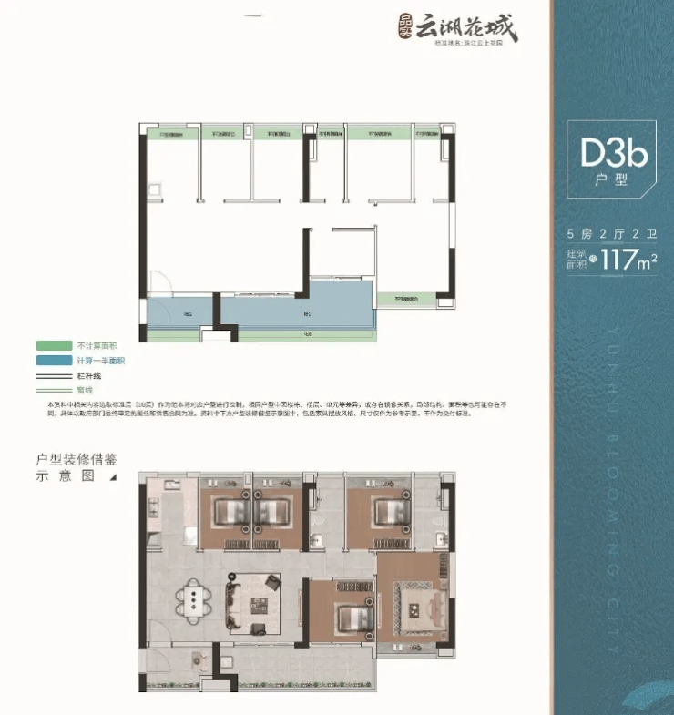 117-118㎡五房两厅两卫:赠送面积约14㎡,实际使用率突破100%,双阳台南北对流,厨卫全明,总价384-401万,多孩家庭福音;