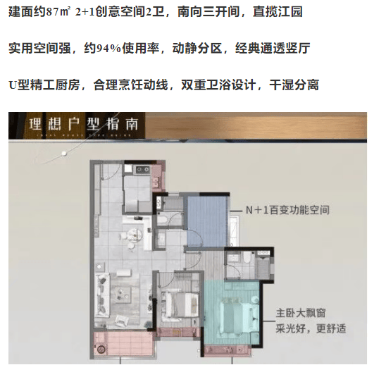 3+1创意空间,拥有南向四开半间,宽敞的采光面,多厅布局,进深约8米,巨幕景观面,景观阳台,头排亲江设计,使用率达到约98%。
