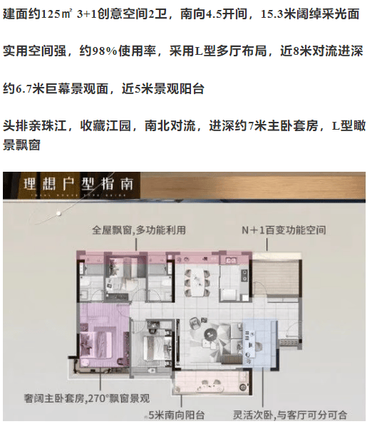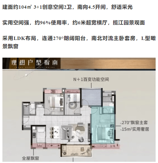 3+1创意空间,南向四开半间,超宽横厅设计,采用LDK布局,连通270°朗阔阳台,南北对流主卧套房,L型瞰景飘窗,使用率达到约96%。